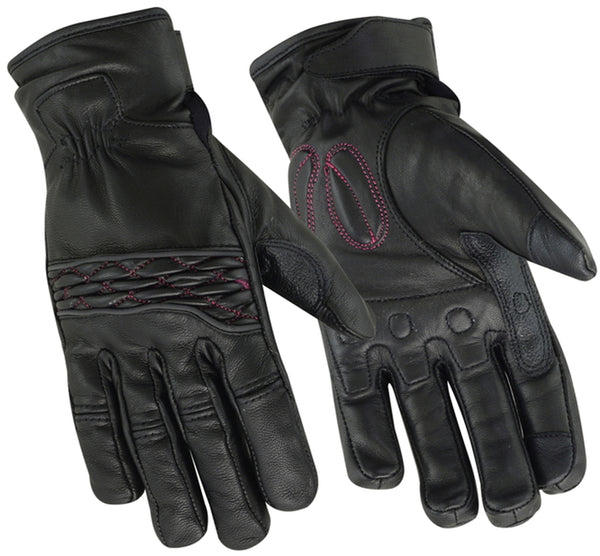 Women's glove made with premium grade durable Aniline goat featuring contrasting hot pink stitching, gel palm, touch screen finger tips, reflective piping, light lining and adjustable wrist strap.