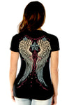 Women's Vintage Wings & Stars short sleeve v-neck top featuring a delicate heart with wings design. Rhinestones give this top an extra kick of embellishment. The back features wings and stars.