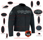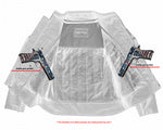 2 inside concealed gun pockets made of special heavy duty textile with built-in holsters and snap closure.