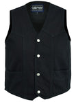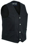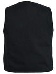 Denim Material.Plain Sides.Black satin liner.1 inside pockets & 2 front pockets.