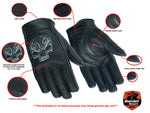 Men's light lined cruiser glove made in premium Aniline goat, featuring leather palm, touch screen finger tips, adjustable wrist strap and specially designed skulls to reflect when headlights turn on...