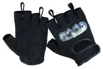 Fingerless gloves made of mesh & synthetic leather featuring hard knuckles, and gel padding on fingers and palm.