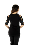 Edgy, cold shoulder, v-neck, half sleeve top with Devilish embellished skull graphic and sexy laser cut slash sleeves.MATERIAL- 95% Rayon and 5% Spandex CARE- Machine Wash With Cold Water Inside...