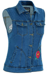 Want to show some personality on your next ride? Our women's blue denim biker vest with red daisies separates itself from other vests. The playfulness of the daisy design, which is embroidered on the front and back of the vest, adds tons of character.