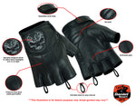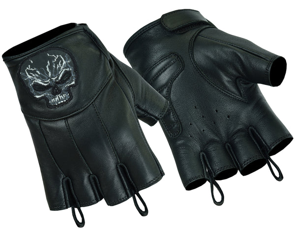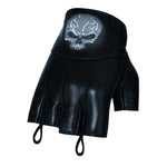 Men's fingerless glove made in premium drum-dyed naked goat leather. Featuring gel palm for long haul comfort, pull-tabs allow for easy removal, an adjustable wrist strapand specially designed skulls to...
