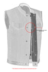 Rough Rub-Off Raw Finish Denim w/leather trimming.Single panel back ideal for easy accessorizing with patches and club logos, embroidery or airbrushed art work.Scoop Collar.Front silver metal # 10 zipper hidden...