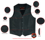 Milled Promo Cowhide 1.0 - 1.1mm. Plain sides.Black satin liner.V-neck collar.Heavy duty snaps.1 inside pockets & 2 front pockets.