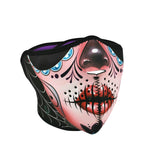 The ZAN Headgear Neoprene Half Face Mask features full coverage of the nose, chin, and cheeks with stretchy, warm and water resistant 2mm thick neoprene. Like most ZAN Headgear face masks it has a black stretch nylon trim for added durability and clean finish. A hook and loop closure allows for adjustability and ensures great fit, and can even be lengthened with our Neoprene Extension Piece (sold separately). Provides coverage of the ears, nose and cheeks from the elements. Can be used with or without a helmet. One size fits most. Sugar Skull design, reversible to Purple. Material: 70% Neoprene, 30% Polyester. U.S. Patented design.