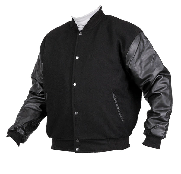 Varsity/Baseball/College Letterman Jacket All black Wool Body & Leather Sleeves by Pro Rider (PR3676) Features: Material: 100% fine quality soft wool (front & Back body) Black Sleeves: Premium Cowhide Leather...